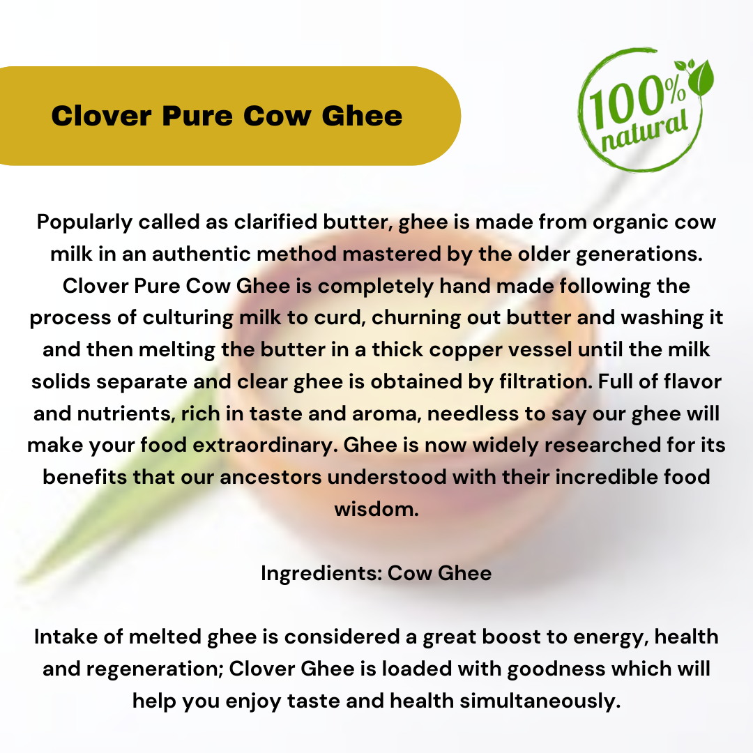 Popularly called as clarified butter, ghee is made from organic cow milk in an authentic method mastered by the older generations. Clover Pure Cow Ghee is completely hand made following the process of culturing milk to curd, churning out butter and washing it and then melting the butter in a thick copper vessel until the milk solids separate and clear ghee is obtained by filtration. Full of flavor and nutrients, rich in taste and aroma, needless to say our ghee will make your food extraordinary. Ghee is now widely researched for its benefits that our ancestors understood with their incredible food wisdom.