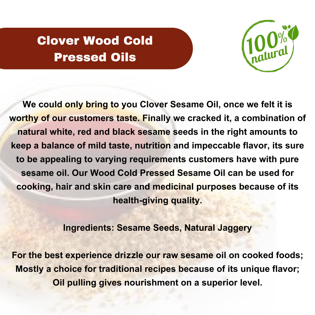 We could only bring to you Clover Sesame Oil, once we felt it is worthy of our customers taste. Finally we cracked it, a combination of natural white, red and black sesame seeds in the right amounts to keep a balance of mild taste, nutrition and impeccable flavor, its sure to be appealing to varying requirements customers have with pure sesame oil. Our Wood Cold Pressed Sesame Oil can be used for cooking, hair and skin care and medicinal purposes because of its health-giving quality.